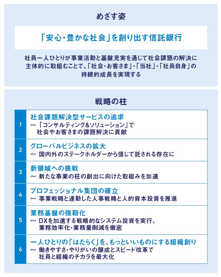 若松 「人をつなぐ。未来をつなぐ。」は貢献価値がシンプルかつ明確であり、MUTBらしい王道なコーポレートメッセージです。中期経営計画では目指す姿として「『安心、豊かな社会』を創り出す信託銀行」を掲げ、その実現に向けて6つの戦略の柱を打ち出しています。(【図表】)