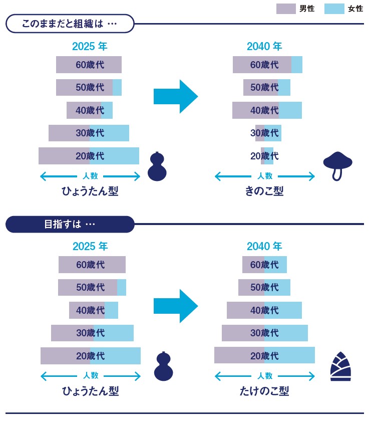 ここまでDE&Iを推進すべき理由や現状、環境づくりについて紹介してきましたが、女性が活躍できる組織づくりの猶予はそれほど残されていません。現在、国内の多くの企業は60歳代、50歳代の社員が最も多く、40歳代前半の人材が少なくなる「ひょうたん型」の組織構造になっています。このまま女性活躍が進まなければ、2040年には20歳代、30歳代が少なく60歳代や40歳代が多い、不安定な「きのこ型」の組織になるのは避けられません。そうした事態を回避するには、未来から逆算しながら多様な人材を受け入れ、末広がりの組織をつくる必要があります。(【図表】)