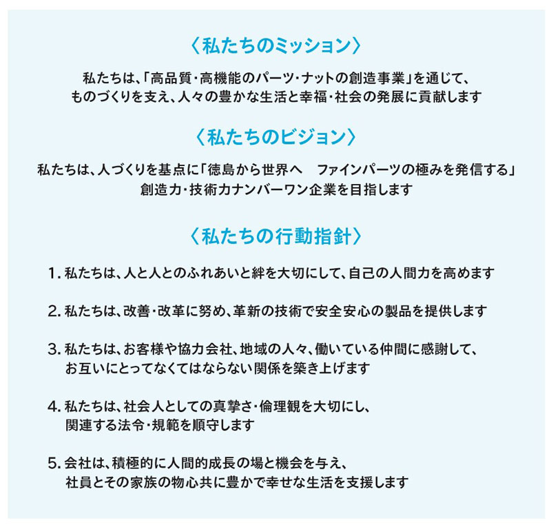 国内の全自動車メーカーに納入するナットを中心に、ファインパーツ※を製造・販売する西精工。徳島県のシンボルである眉山を間近に望む本社に来客があると、1階オフィスの全社員が立ち上がってあいさつし、丁寧に迎え入れる。