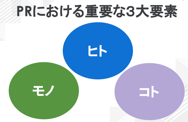PRにおける重要な三大要素はヒト、モノ、コトである。自社のネタでどのように報道価値を付加し、テレビ取材を獲得していくのか。報道価値を生むには、次の6つが必要な要素となる。①チャンネルが止まる「絵力」(ない場合は極端に大胆に変化させる)、②人の心を動かす「物語」(例:90歳のピザ職人)、③今の季節に国民が考えていること(例:夏はエアコンを使用するので電気代が心配)、④ニュースがキッカケで起きている現象(例:甲子園フィーバーに便乗! ○○グルメ)、⑤当たり前から少しズレている「違和感」(例:ギャル×霊媒師)、⑥何かの記録になっている(例:日本一、世界最大級)。